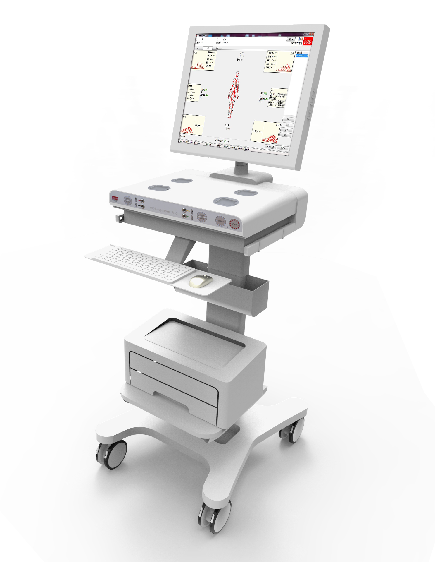 Previous test methods did not offer automatic assessment. The boso ABI-system uses a software offering several advantages. Once a reading has been taken, the results are automatically allocated to the selected patient. The system measures other important cardiovascular parameters in addition to the ABI and shows all data at one glimpse. The GDT interface allows data to be transferred to the doctor‘s DTP system.