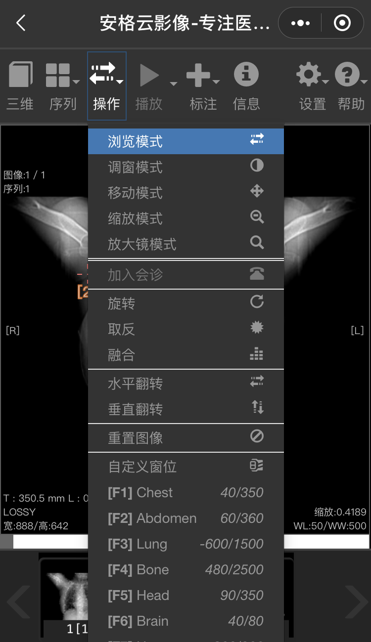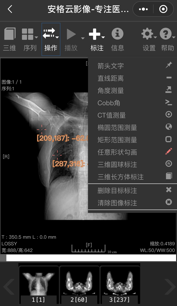 安格云胶片支持缩放、移动、动态展示、多维成像,CT值测量等等保证了高质量的读片效果,有利于医生更精准、更合理地做出诊断及治疗决策,极大地满足患者就诊、转诊和远程会诊的需求。