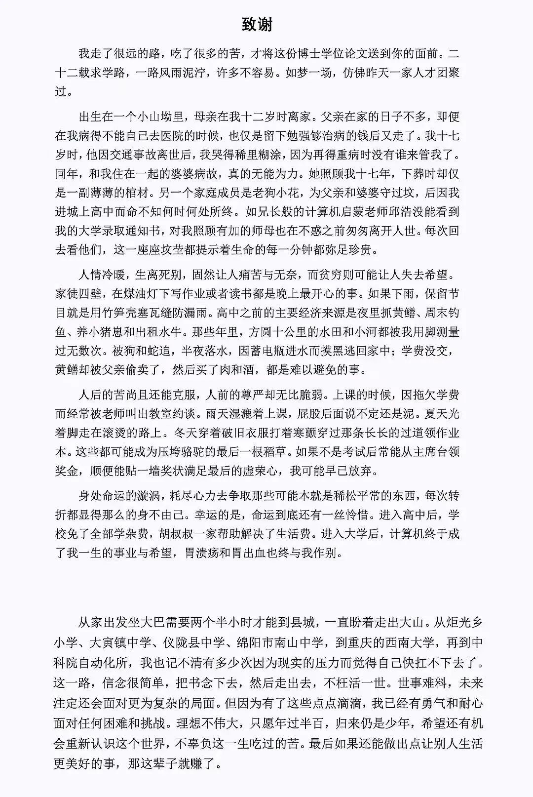 论文作者黄国平在这篇《致谢》中对自己成长环境和求学经历的回顾,感动了无数网友,也鼓励和温暖了很多有相同经历的人。