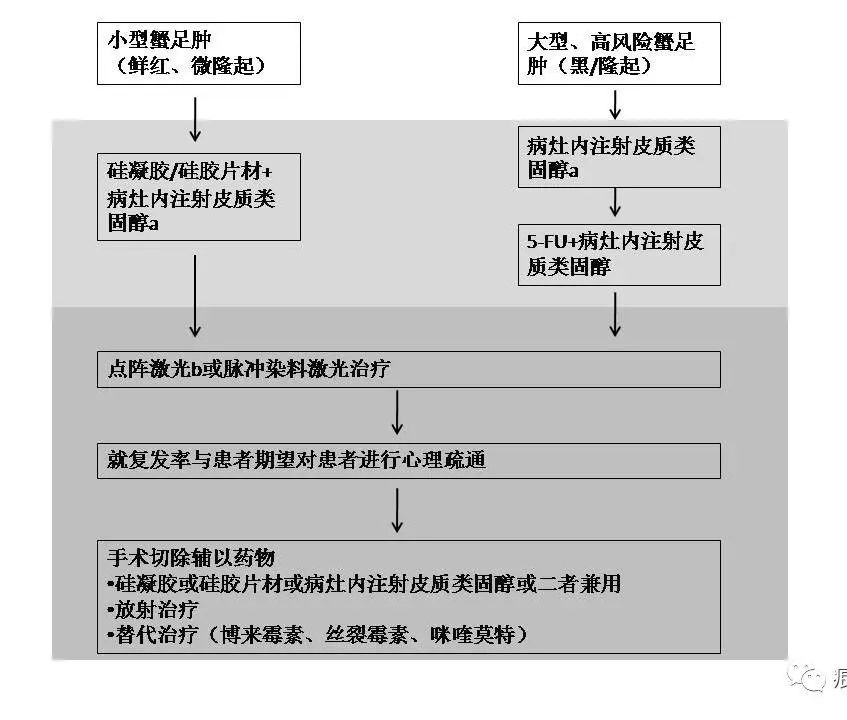 对于高风险的伤口,以硅酮为基础成分的产品是首选预防措施。硅凝胶或片材应在伤口或切口愈合后使用,并至少使用1个月。对于硅胶片材,建议每天最少保持接触患处12小时,如果可以,持续覆盖24小时,建议每天清洗两次。对于日常活动,较大面积的部位,面部,以及才炎热潮湿的环境下,霜状或软膏状的硅凝胶比硅凝胶片材更好。严重的时候,最好合并使用病灶内注射皮质类固醇。